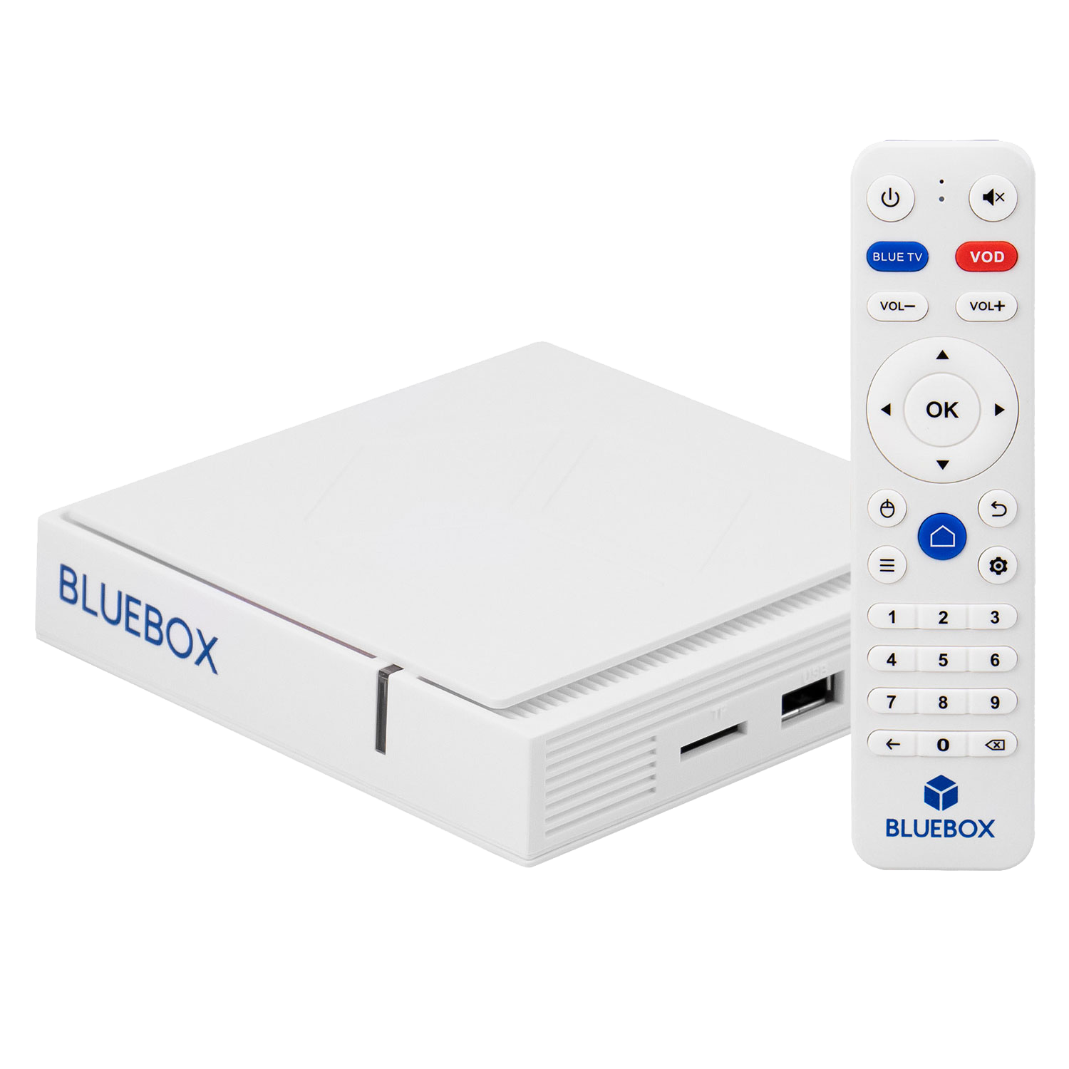 Receptor Bluebox com Wi-Fi, USB, HDMI e MicroSD. Equipado com 2GB de RAM e 16GB de memória interna, oferecendo alta performance e ampla conectividade para uma experiência de entretenimento imersiva.